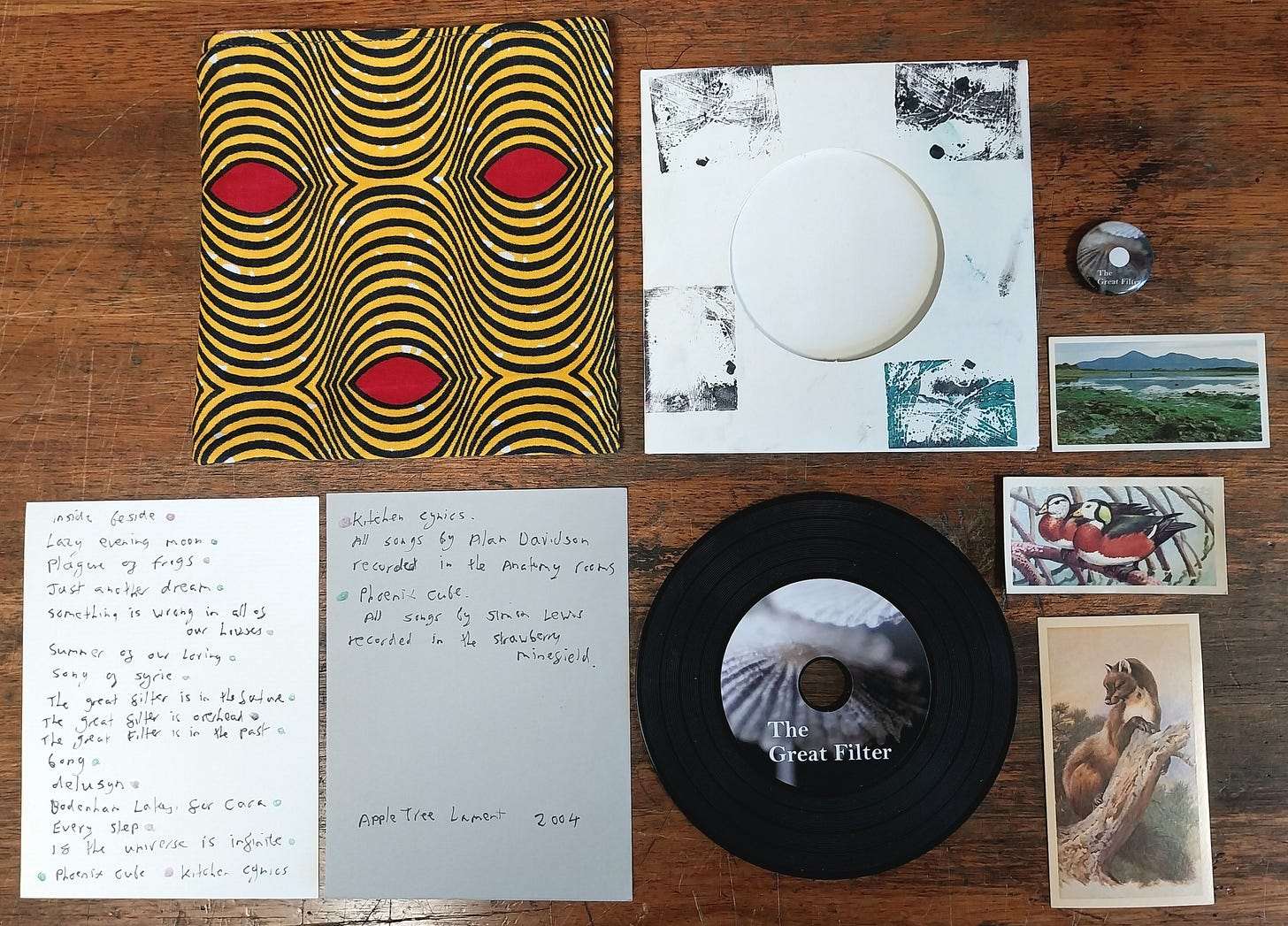 One of the delights of reviewing independent and underground releases is that you sometimes receive unusual, hand-made packages. I also have used this idea to connect with my fans, offering hand-made one-off box sets for Blue Lily Commission, Mooch, and my solo music. The Great Filter by Phoenix Cube & Kitchen Cynics (aka Simon Lewis and Alan Davidson) is one such, beautifully packaged in a cloth bag with all sorts of goodies inside along with the CD - see my photograph below.